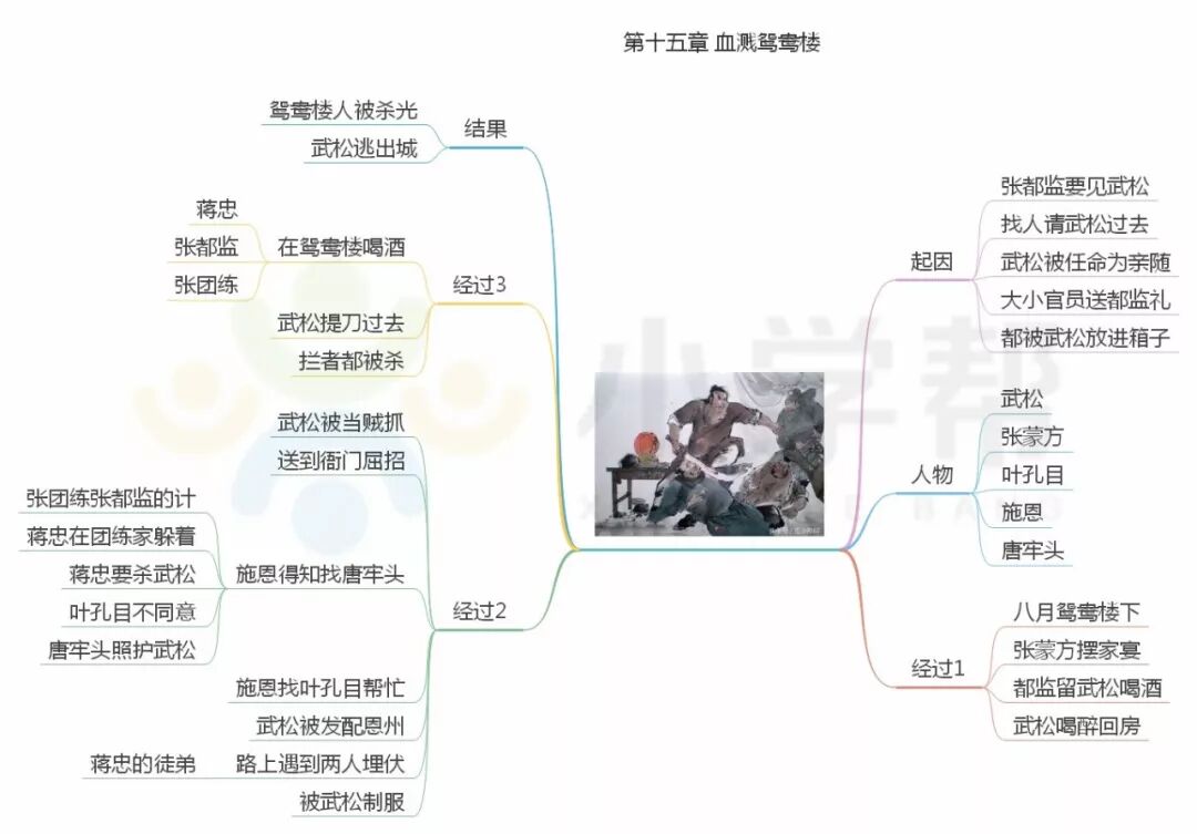 《水浒传》的情节生动曲折,大小事件都写得腾挪跌宕,引人入胜。有一些段落,集中了很多人物、精彩的场面,如智取生辰纲、三打祝家庄等。而每一组的情节又往往是人物的性格发展史,如景阳冈打虎、斗杀西门庆、醉打蒋门神、大闹飞云浦、血溅鸳鸯楼等情节,使人不期然想起武松。