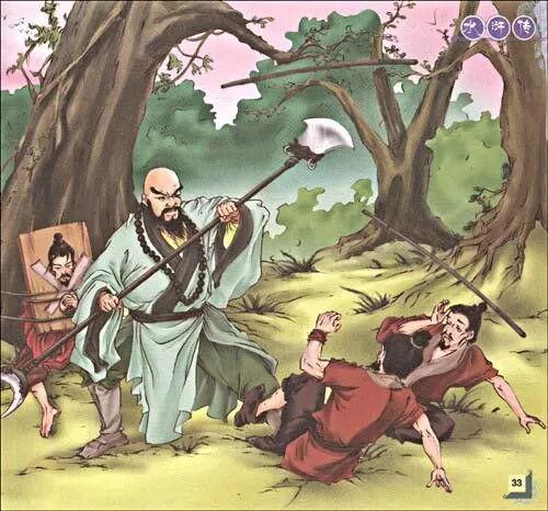 鲁智深 | 主要人物之一,本名鲁达,是渭州经略府提辖,出家后法名智深,因脊背上刺有花绣,人称花和尚。作品写他是天孤星下凡。 生得面圆耳大,鼻直口方,腮下一部貉猱胡须,身长八尺.腰阔十围,使一件六十二斤禅杖,力大无穷,曾倒拔垂杨柳。他只身一人,无家无业,长期的军旅生活和下层军官的阅历,不只锻炼出他一身好武艺,也造就了他粗豪爽直、酷爱自由、疾恶如仇、见义勇为的思想和性格。 禅杖打开危险路,戒刀杀尽不平人。他对社会的压迫和不平,怀有强烈的愤懑,对各种罪恶势力,主动挑战。为救金氏父女,三拳打死恶霸镇关西,军官当不成,上五台山当了和尚。 又不守佛门戒律,二次大闹寺院,被住持打发往开封大相国寺,在那里与林冲结识。 林娘子被高衙内调戏,林怕得罪高俅容忍退让,而他则声言要高吃他三百禅杖。当林被刺配沧州时,他暗中保护,大闹野猪林,粉碎了高俅中途加害的阴谋。 由于他与上层统治者对抗,和尚也当不成,一把火烧了菜园廨宇,先上二龙山,后归梁山泊,走上武装反抗的道路。在梁山为步军头领.是义军的中坚力量,不只在反击围剿、攻州夺府中奋勇冲杀,而且对当权者认识较清,抵制宋江盼招安的错误主张,指出满朝文武多是奸邪,就比俺的直裰,染做皂了,洗杀怎得干净?招安不济事,便拜辞了,明日一个个各去寻趁罢。 出于同生同死的义气,他没有各去寻趁,也随之受招安,参与平田虎,王庆、方腊。 眼见兄弟相残,他满腔悲愤,心已成灰,不愿随宋江还朝做官,在杭州六和寺坐化。 |