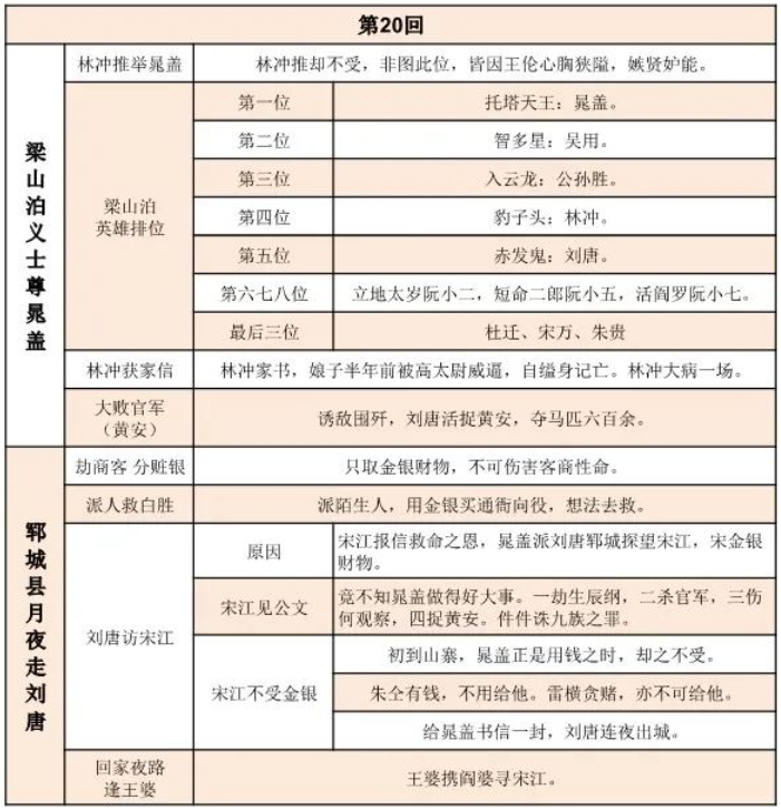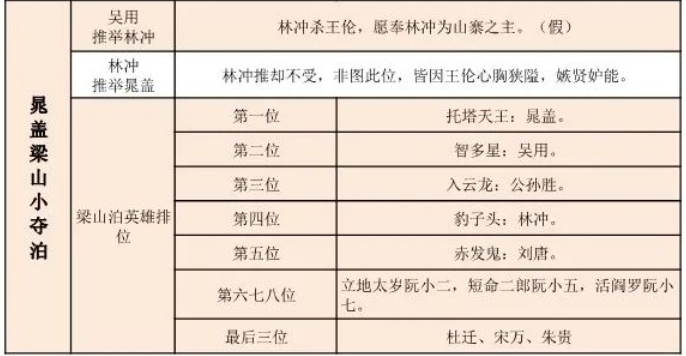 林冲推晁盖为首,吴用,公孙胜为辅,自己坐了第三把交椅。吴用施计,大败官兵,捉拿黄安,得了不少人马船只,劫获财物金银无数。制定接下的任务:一是救白胜,二是谢宋江。刘唐持金银和晁盖手书,郓城月夜见宋江,宋江收收下晁盖谢书信,却不接受金银的馈赠。