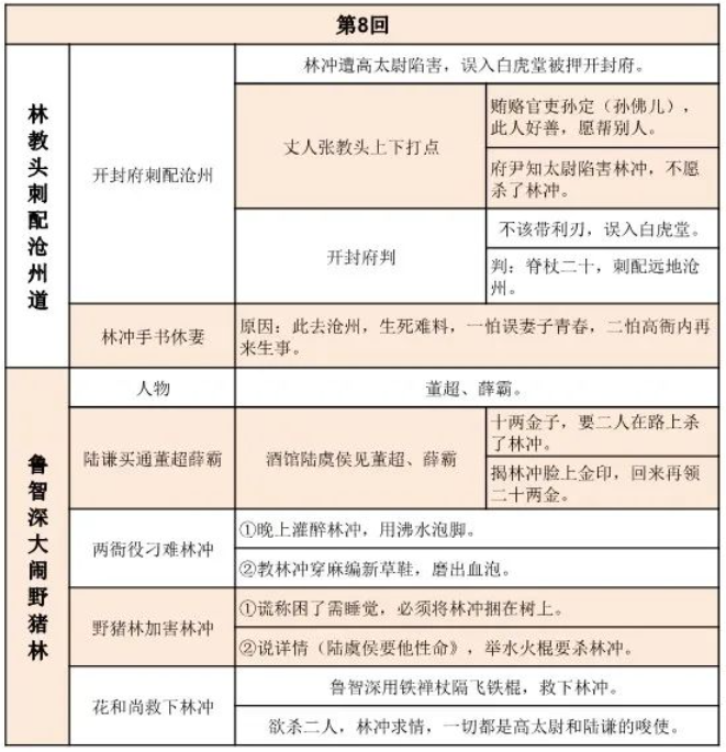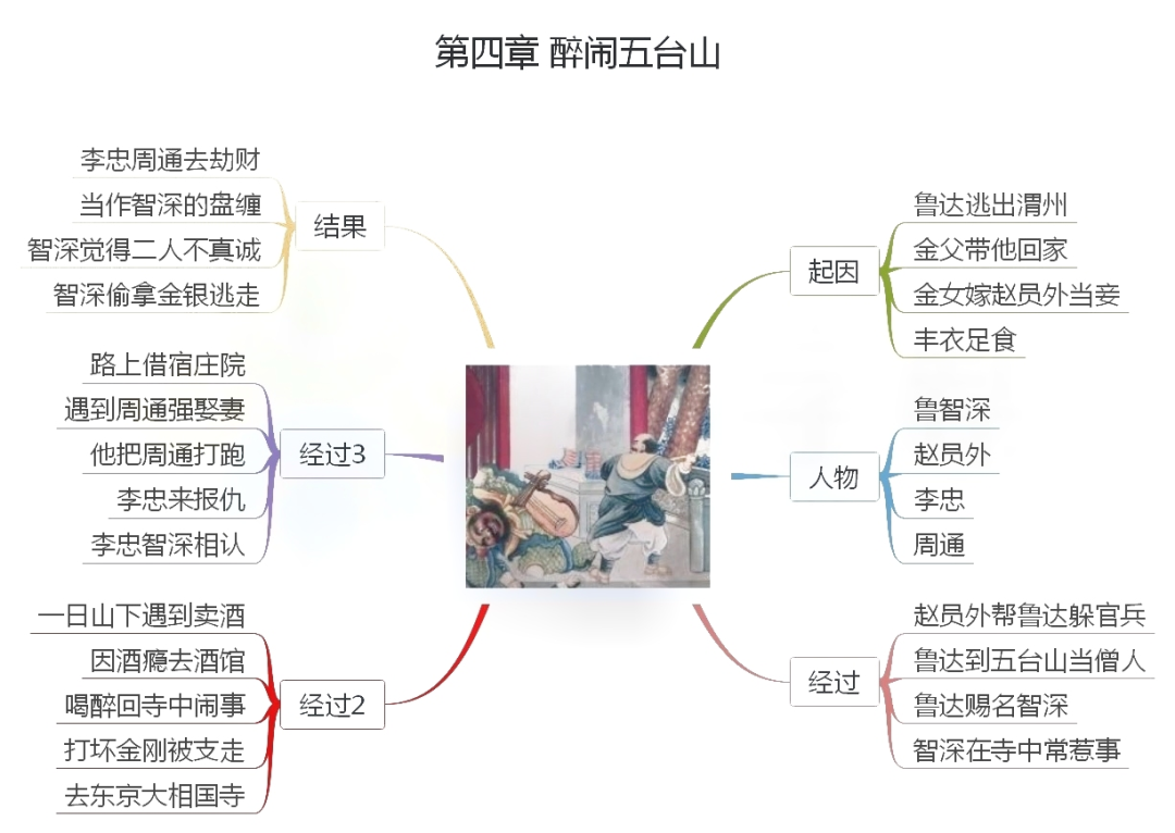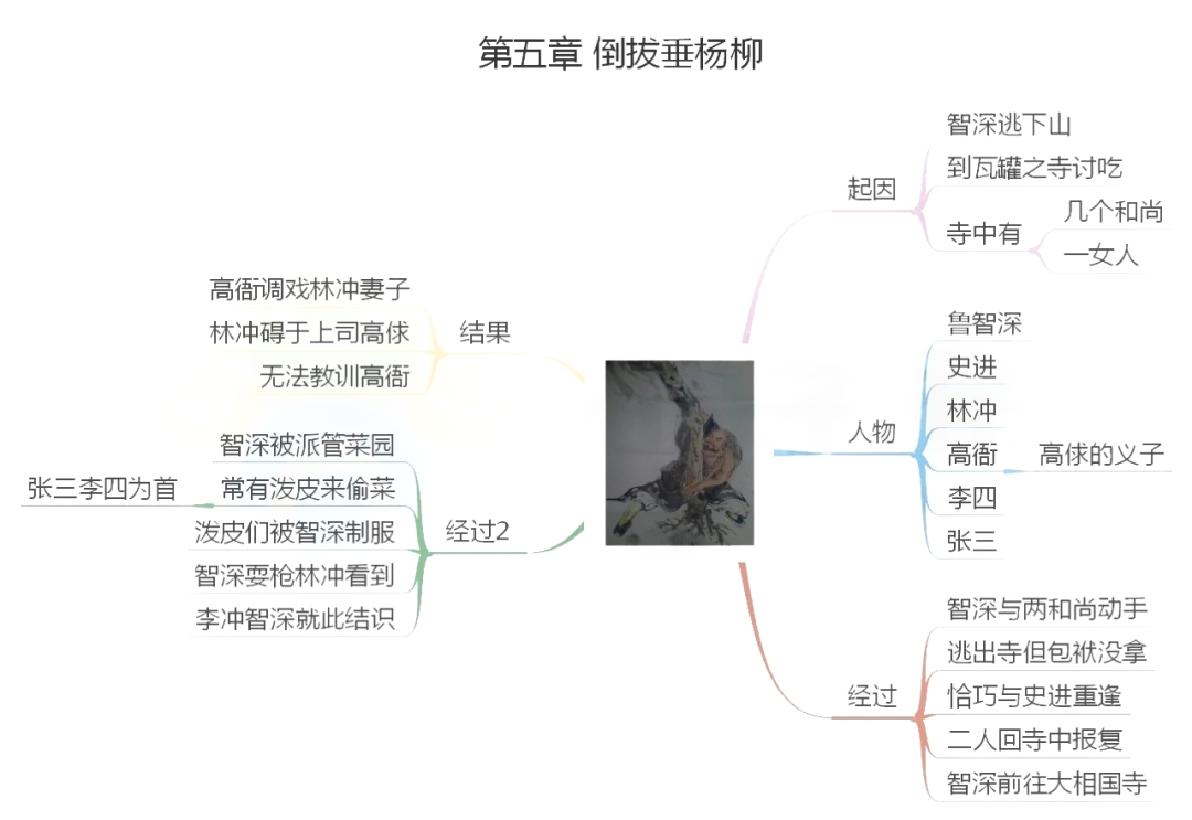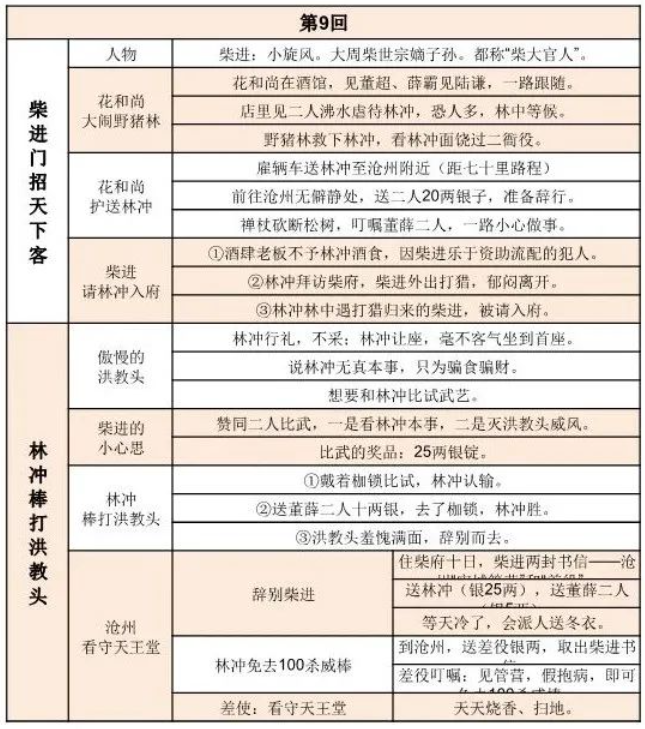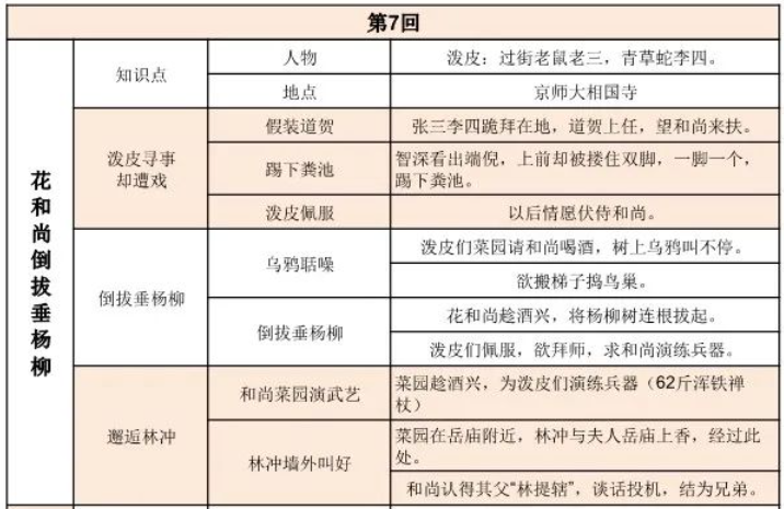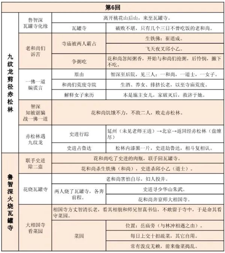 在寺院上了假扮道士和尚,实则捣毁寺院,养女吃酒的崔道成和丘小乙的当,二次复回,被二贼击败,到赤松林,遇到剪径的史进,二次再回寺院,打死崔、丘二贼,烧了瓦罐寺。投大相国寺管菜园,被一帮泼皮包围。