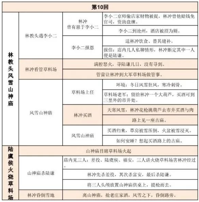 陆虞候再次设计陷害林冲,曾被林冲救过命的店主人李小二向林冲报告了消息,林冲怒寻陆谦不遇。管营派林冲管草料场,欲烧死林冲。林冲杀死了差拨,富安,陆谦。林冲在一庄上烤衣讨酒,打散庄客,醉倒雪地,被庄客捉住。