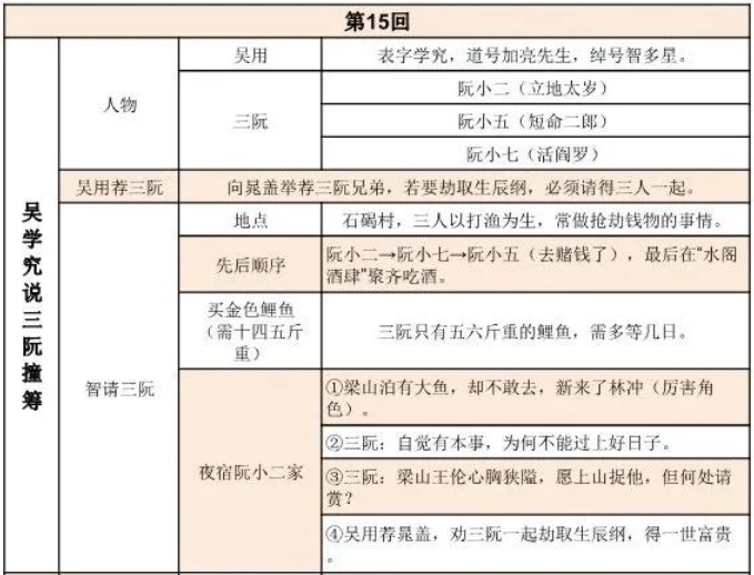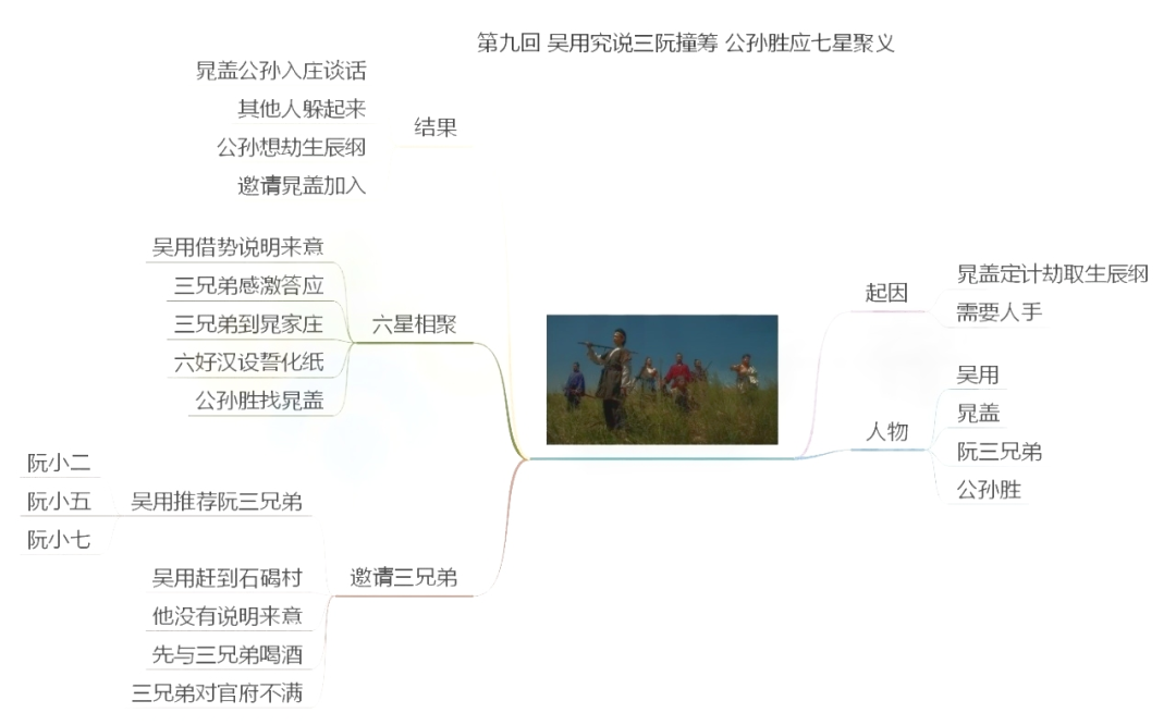 吴用向晃盖,刘唐介绍三阮。并连夜起程行百二里地,来到梁山泊边的石碣村。阮氏三弟兄充满对官府之满;而对梁山泊好汉则生羡慕之情。吴用因势利导,说转三阮。六好汉在晃家庄设誓化纸;公孙胜强求会见晃盖,与晃盖说知取不义十万贯之财的事。