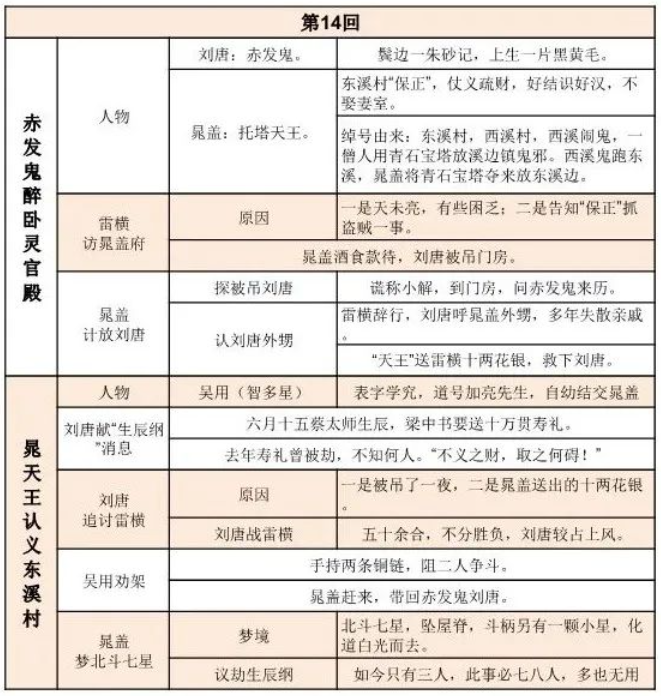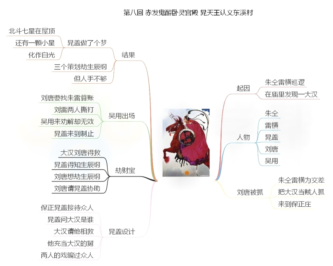 晁盖设计救了专门拜访他的刘唐,以甥舅相称,瞒过雷横。又送雷横银两。刘唐向晁盖说知梁中书要用十万不义之财买来金珠宝贝庆贺蔡京生日,取之何碍。晁盖曰:壮哉。叫他安歇,从长计议。刘唐去赶雷横,要追回晁盖送的银两,与雷两扑刀相斗,吴学究铜链相隔,晁盖赶来劝住。晁,吴,刘三人计议智取梁中书不义之财。