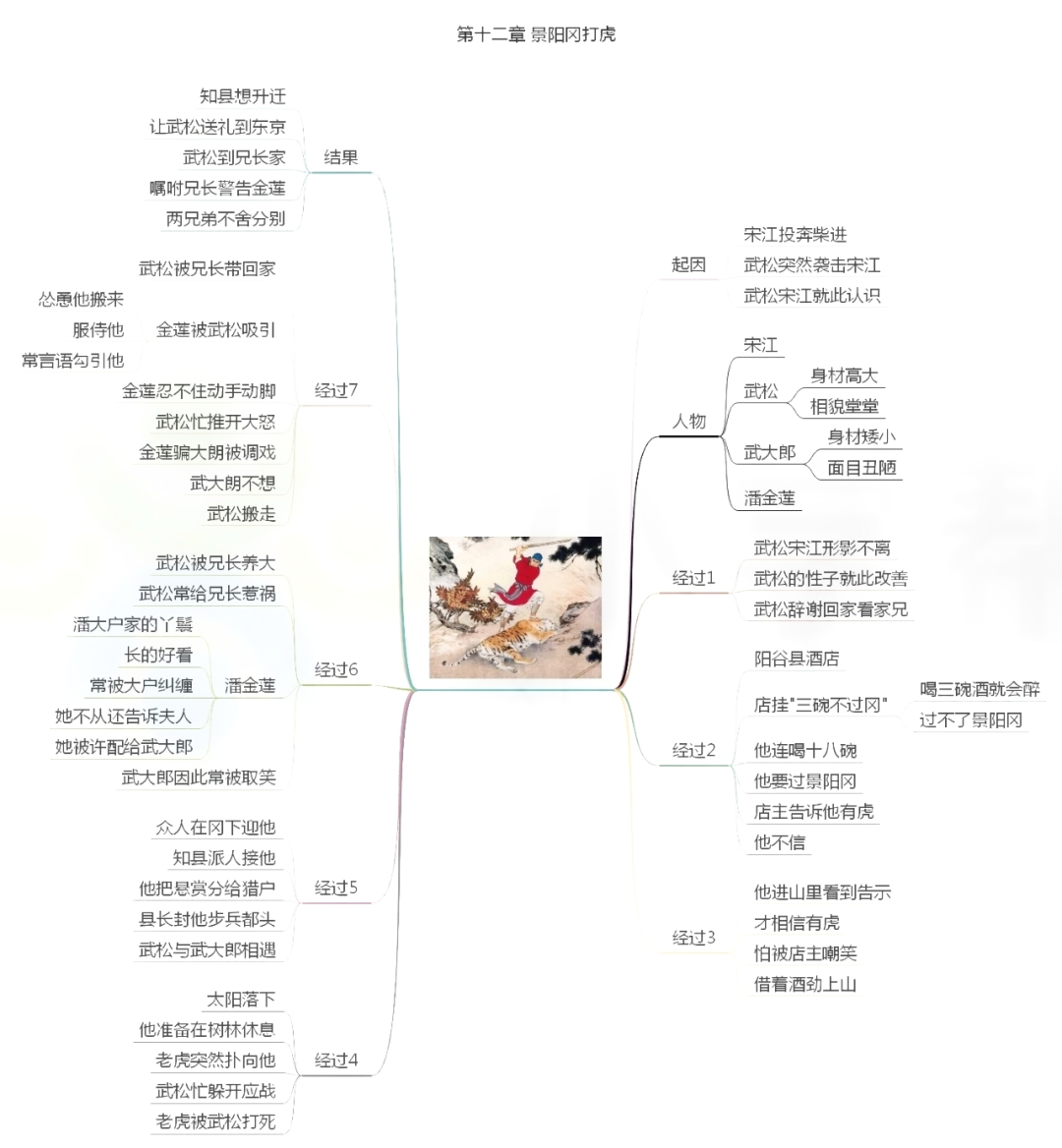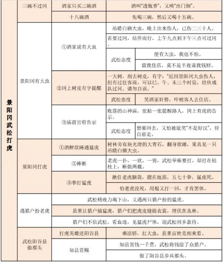 武松回家探望哥哥,路过景阳冈。在冈下喝了很多酒,踉跄着向冈上走去。由于酒力发作,便找了一块大青石,仰身躺下,刚要入睡,忽听一阵狂风呼啸,一只斑斓猛虎朝武松扑了过来,武松连躲过两次。老虎急了,大吼一声,用尾巴向武松打来,武松急忙跳开。老虎兽性大发,又向武松扑过来,武松顺势骑在虎背上,左手揪住老虎头上的皮,右手猛击虎头,把老虎打得眼、嘴、鼻、耳到处流血,趴在地上不能动弹。又举起哨棒打了一阵,见那老虎确实没气了,才住手。知县赏钱一千贯,武松把钱散与猎户。知县抬举武松为步兵都头。从此武松威名大震。