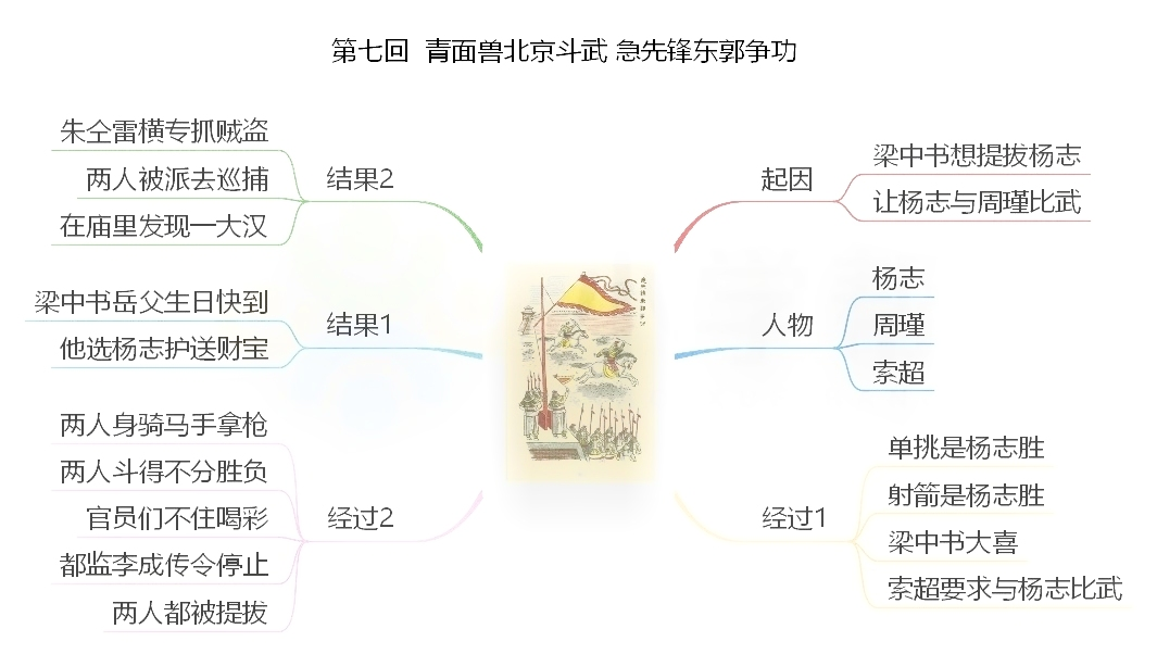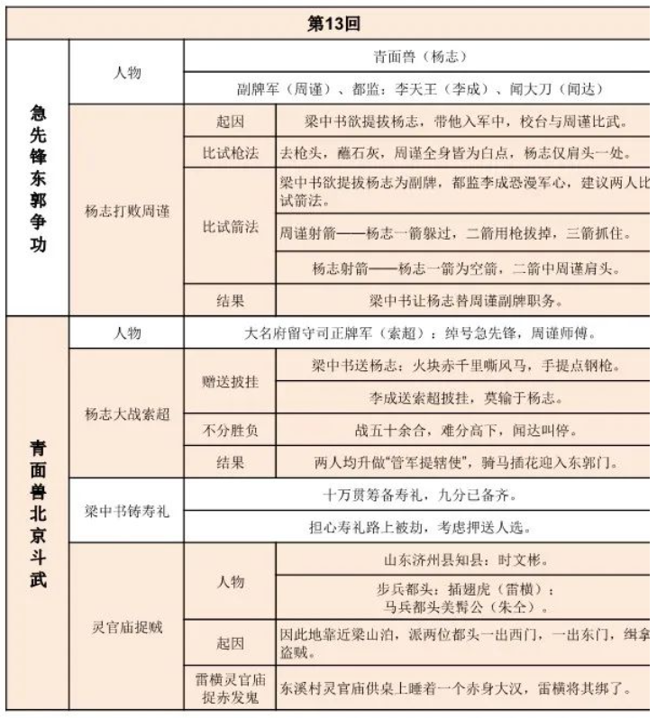 杨志枪胜周谨,箭胜周谨。又与索超相斗,不分胜负,两人都被封为管军提辖使。梁中书与夫人商议收买十万贯礼物玩器,选人上京去庆贺蔡太师生日。朱仝、雷横巡捕贼人,在东溪村边的灵官庙里抓住赤发鬼刘唐。
