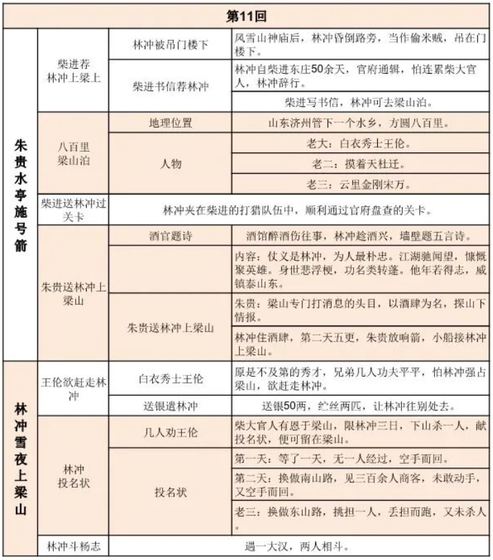 林冲被捆至柴进庄暂住。官司追捕甚急,柴进周济他去梁山。在酒店吃酒时乘酒兴赋诗一首。发抒对高俅的不满,表现对未来的向往。与朱贵相识,被船接去梁山泊。王伦出于嫉妒人心,先不肯收留。后要林冲拿报名状来,林中下山等了两天,第三日等得一人,却是杨志。