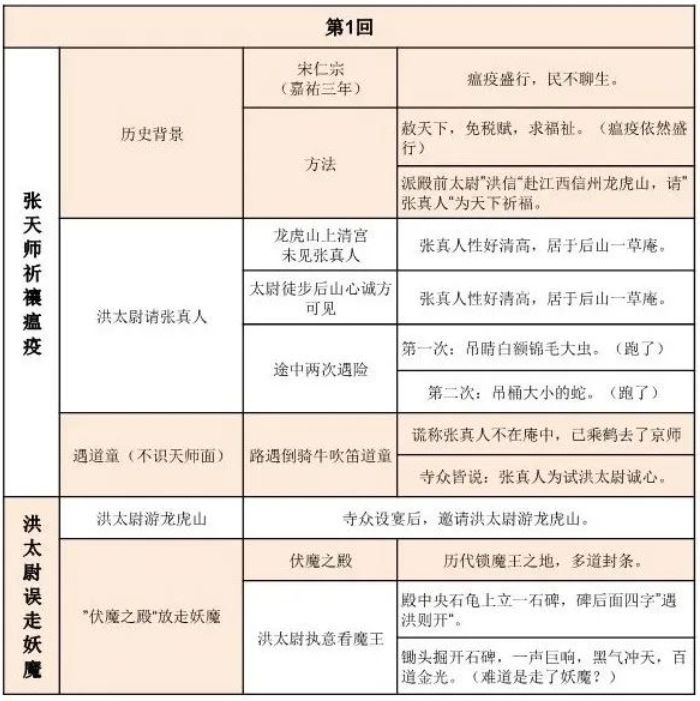 仁宗嘉右三年,瘟疫盛行,洪太尉奉皇帝命前往江西信州龙虎山,宣请嗣汉天师张真人来朝禳疫。洪太尉上山求见天师不成。回至方丈,不顾众道士劝阻,打开伏魔之殿,放出妖魔,遂致大祸。他吩咐从人,隐瞒走妖魔一节,假报天师除尽瘟疫,得到仁宗赏赐。