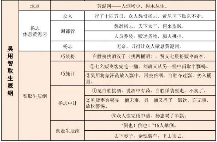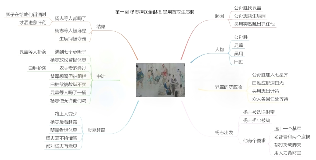 七星聚义,在黄泥冈东十里路的安乐村白胜处安身。梁中书要杨志送宝,杨志不要大张旗鼓,而要扮做客商。并要老都管、两个虞候都听他的,不要在路上闹别扭。一行十五人,出北京城,取大路往东京进发。正是五六月天气,酷热难行,军汉倒地。七个好汉装做贩枣子的小本经纪人,白胜装做卖酒的,八人使计用蒙汗药药倒众军汉,老都管,老虞候。杨志喝得少,起得早,要跳冈自尽。