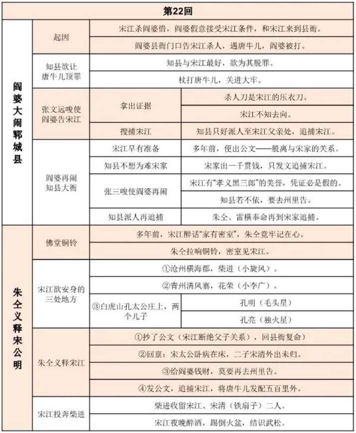 知县想庇护宋江,只把唐牛儿问罪;阎婆再三哭闹,又在张文远(张三)的唆使下,大闹县衙。知县无奈,便差朱仝,雷横捉拿宋江。宋江藏于家中,朱仝有意放走;雷横不捉拿宋太公。两人只抄宋江和父亲断绝关系的执凭公文回县回话。宋江与兄弟宋清到柴进庄上躲避,撞见正发疟疾烤火的武二郎,武松正要在病好后去拜访他。
