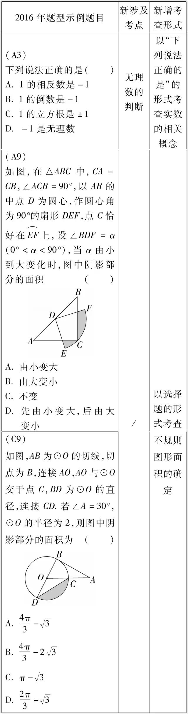 2016说明变化点仅体现在题型示例上, A、B、C三组示例中共有49道试题被更换,其中新涉及考点2个,新增考查形式8种,具体如下表: