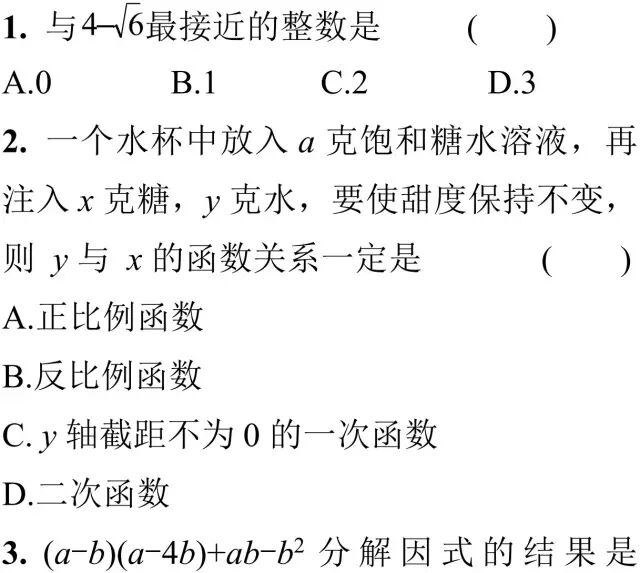 估测题:在选择、填空题中各出现1道单独考查估测的试题(见P153第1题、P157第25题)。